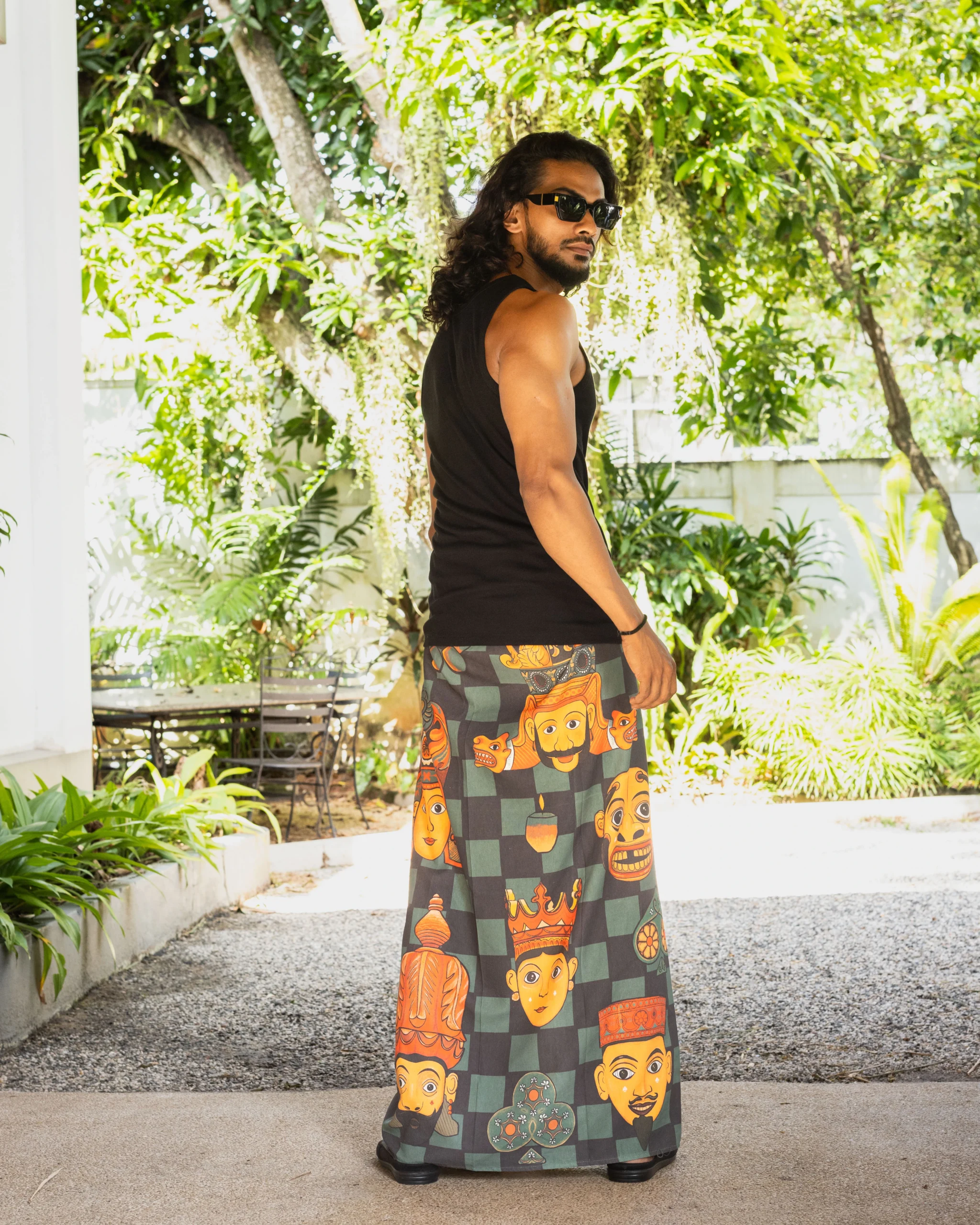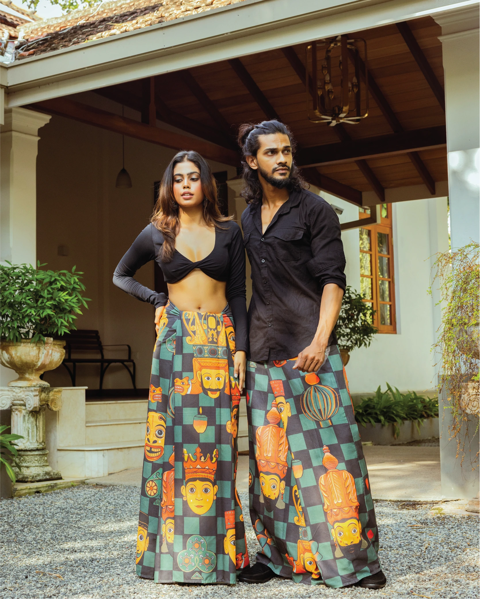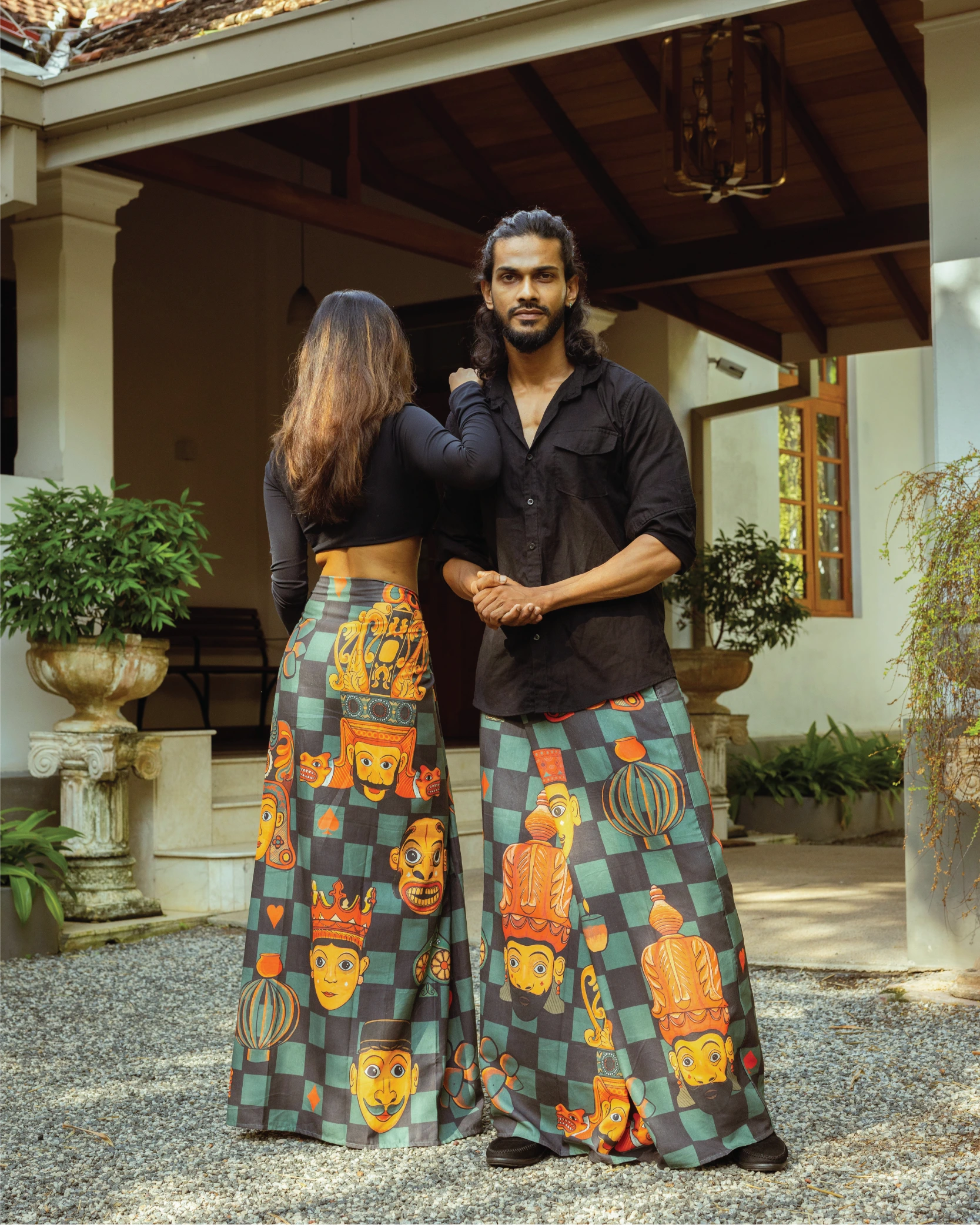 This artwork is inspired by Kolam, a traditional Sri Lankan folk performance where masked characters come alive to tell stories, entertain, and often deliver social satire.