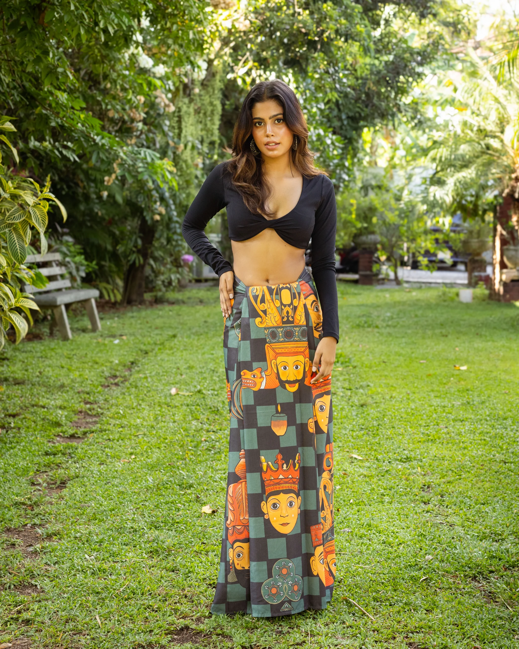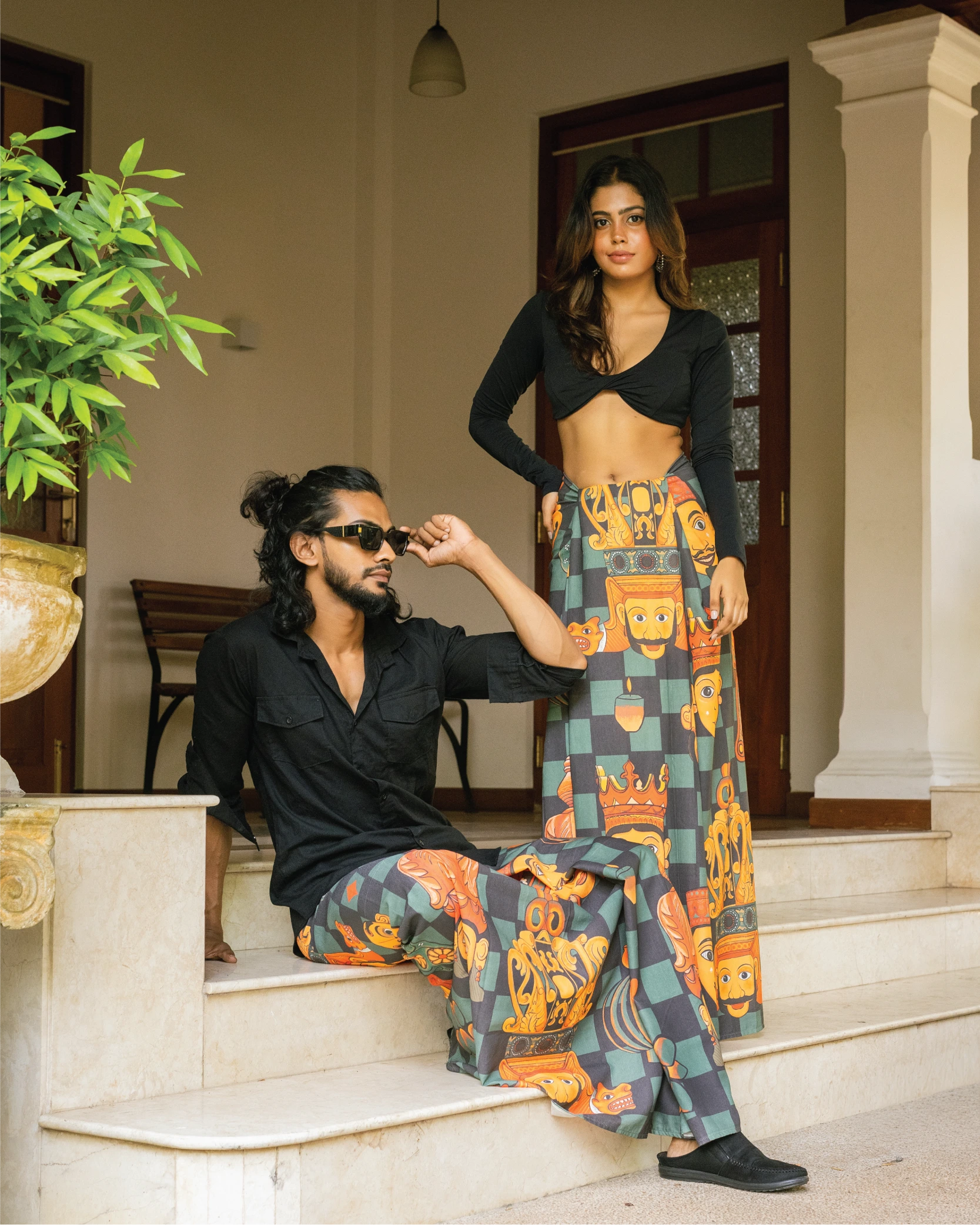 Each mask tells its own story — from kings and queens to villagers, demons, and jesters — weaving comedy, drama, and morality tales. Performed in open village settings, Kolam blends dance, storytelling, and caricature to mirror everyday life and social roles. In this playful take, checkerboard and card motifs bring in elements of fun to harmonize with the positivie energy of Kolam echoing the spirit of village games alongside this rich tradition.