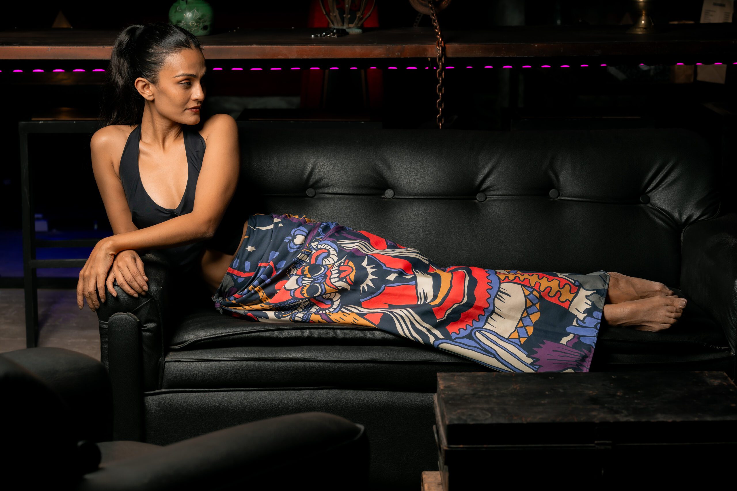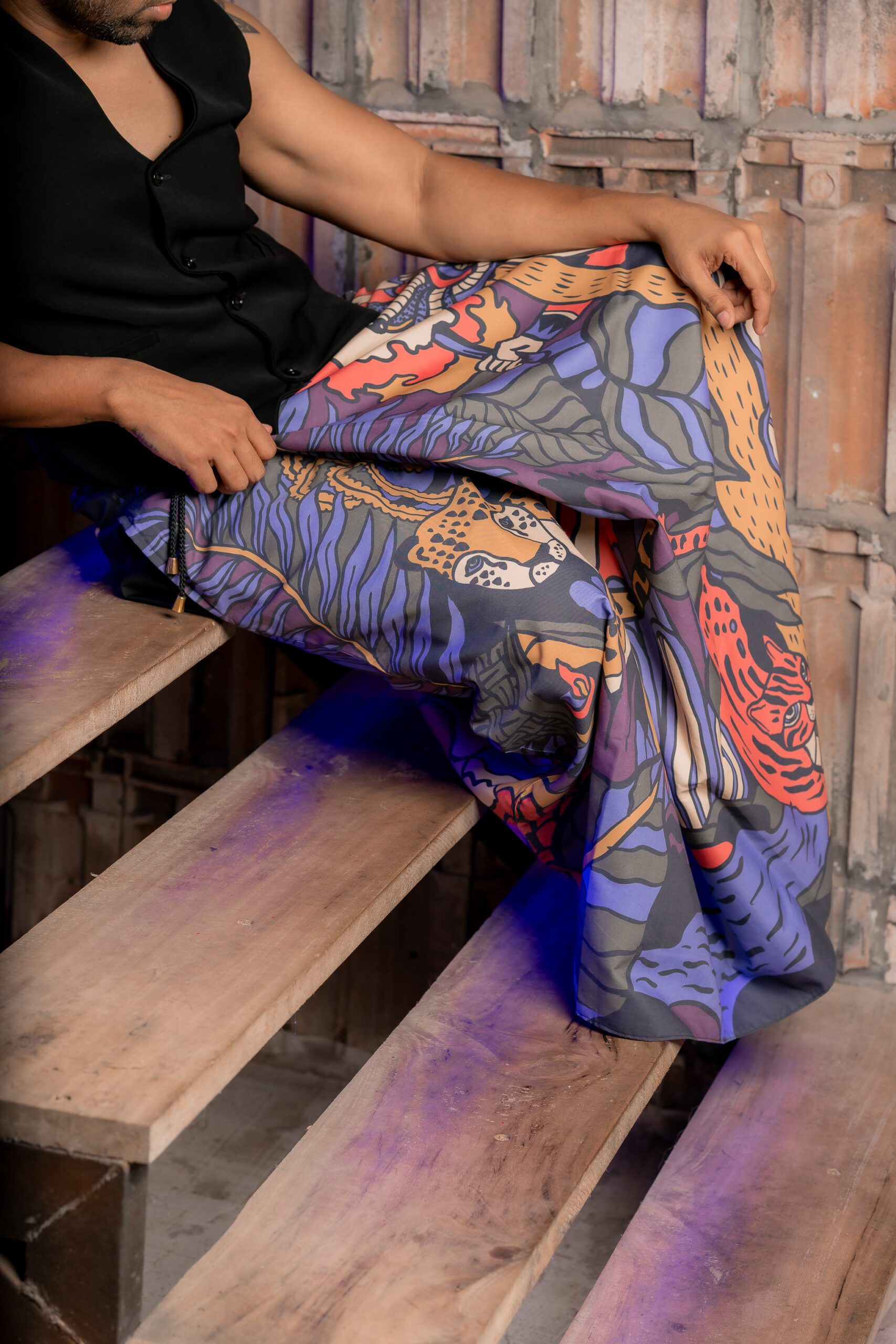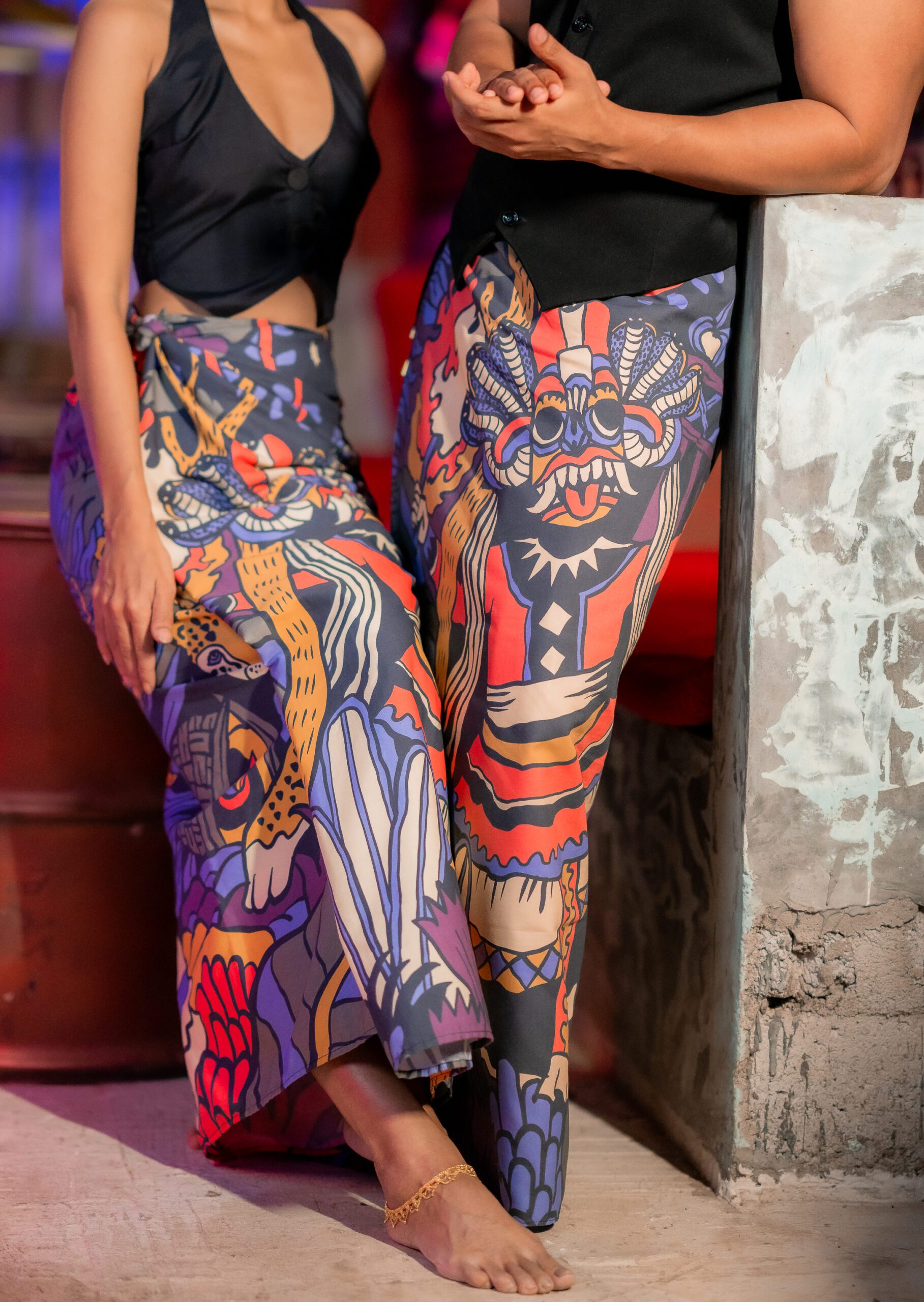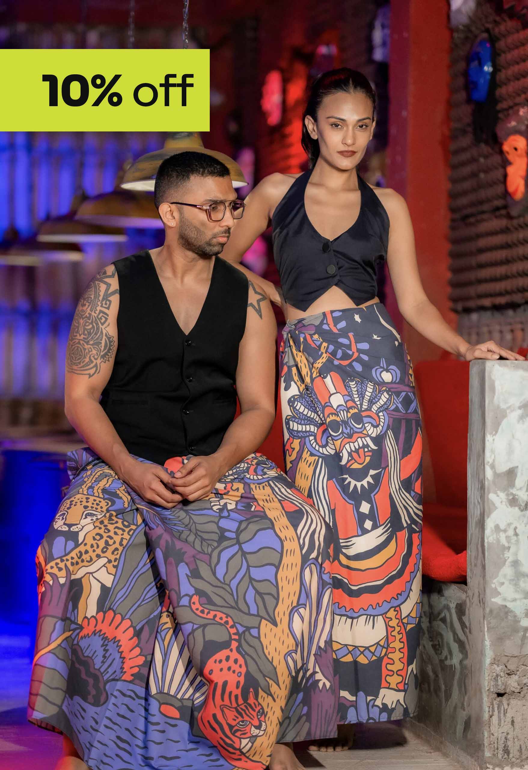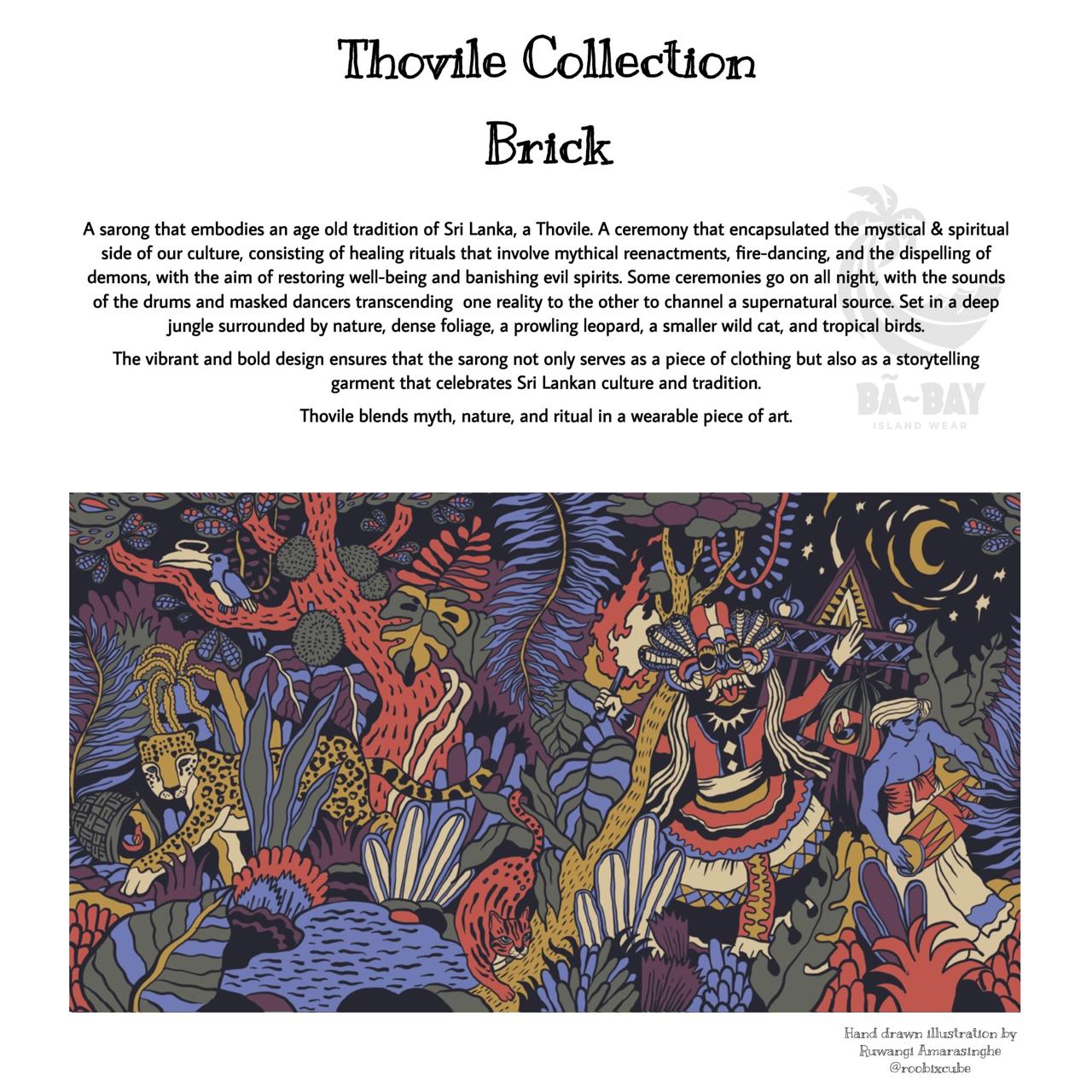 A sarong that embodies an age old tradition of Sri Lanka, a Thovile. A ceremony that encapsulated the mystical & spiritual side of our culture, consisting of healing rituals that involve mythical reenactments, fire-dancing, and the dispelling of demons, with the aim of restoring well-being and banishing evil spirits. Some ceremonies go on all night, with the sounds of the drums and masked dancers transcending one reality to the other to channel a supernatural source. Set in a deep jungle surrounded by nature, dense foliage, a prowling leopard, a smaller wild cat, and tropical birds.